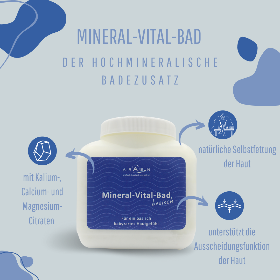 Tauchen Sie ein in die Welt der Entspannung und gönnen Sie Ihrer Haut die Pflege, die sie verdient. Das hochmineralische basische „Mineral-Vital-Bad“ von AIRASUN unterstützt die Ausscheidungsfunktionen und die natürliche Selbstfettung der Haut. Es ist auch ideal für Cellulite-Wickel geeignet.